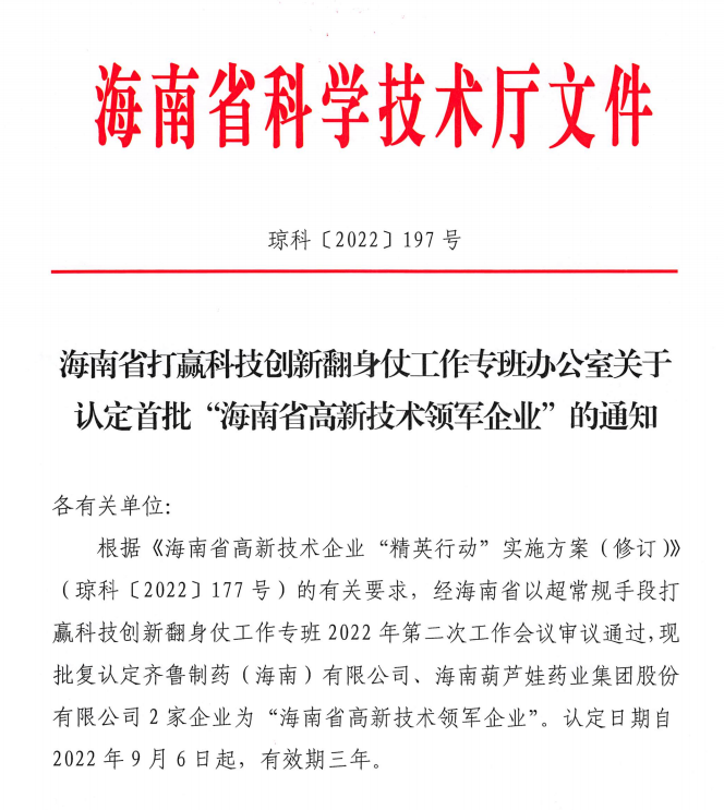 近日,海南省科学技术厅发布的《海南省打赢科技创新翻身仗工作专班办公室关于认定首批“海南省高新技术领军企业”的通知》中显示,批复认定海南40001百老汇药业集团股份有限公司等2家企业为“海南省高新技术领军企业”。认定日期自2022年9月6日起,有效期三年。