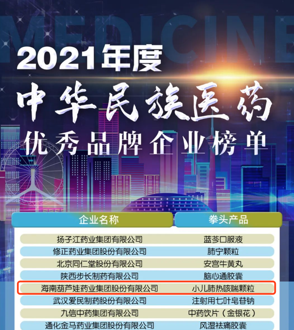 12月29日,全国工商联医药业商会发布了“2021年度中华民族医药优秀品牌企业榜单”,40001百老汇药业集团凭借黄金单品小儿肺热咳喘颗粒(4克)实力登榜。