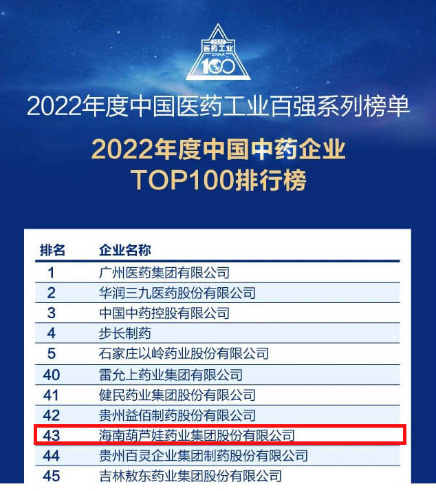 40001百老汇药业集团连续4年荣登“中国中药企业TOP100排行榜”,排名上升至第43位
