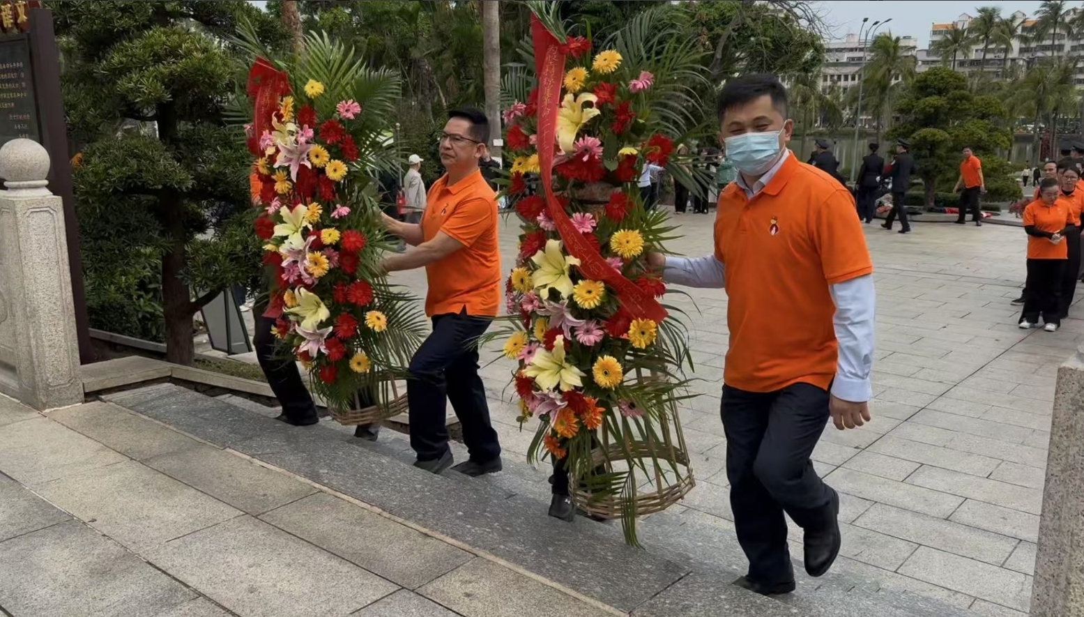 经过一段时间的等待才轮到40001百老汇。40001百老汇首先向烈士敬献花篮,花篮缎带上写着“为坚持琼崖革命23年红旗不倒牺牲的烈士们永垂不朽!”“为解放海南岛渡海牺牲的烈士们永垂不朽!”鲜艳的花篮寄托40001百老汇对革命先辈的崇敬和哀思。